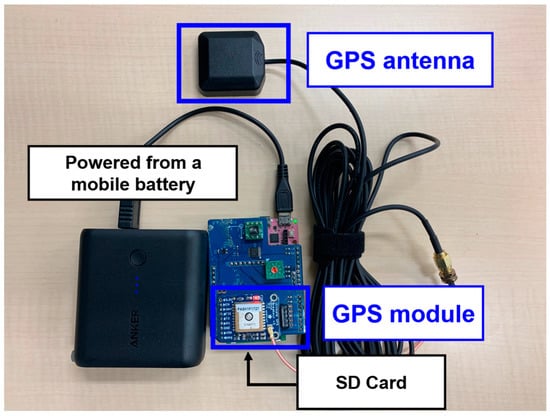 Figure 3 shows the GPS receiver installed on the bridge. The GPS receiver for bridges consists of a microcomputer (GR-peach by Core Corporation, Tokyo, Japan), a GPS module (ADA-746 by Adafruit, New York, NY, USA), and a GPS antenna. Power is supplied from the mobile battery, and the data are recorded on the SD card. A GPS receiver was installed at each entrance and exit of the bridge (right and left side) to measure the bridge position. The target bridge was a simple support beam in Ibaraki prefecture, Japan, which has a joint. The bridges driven in this study are summarized in Table 2 (bridge names are anonymized). Only the time overlapping with the vehicle measurement data is extracted and linearly interpolated at 300 Hz from the bridge position information data.