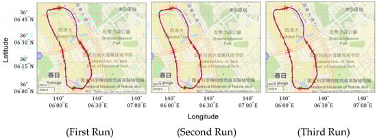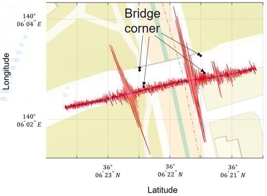 Although many papers explicitly state that they measure vehicle vibration, many also assume the use of vehicle position in their signal processing [,]. Satellite positioning, navigation, and timing systems, the so-called GPS (Global Positioning System), can measure a vehicle’s position. However, the readily available GPS devices are also subject to significant errors, so a vehicle’s travel position is not reliable. Bridge locations can be obtained from GIS (Geographic Information System) data, but the resolution is too coarse. Accurate information on the location of each bridge is usually unknown or not digitized. Furthermore, drive-by monitoring primarily uses data only while a vehicle passes over a bridge. Because the time that a vehicle travels on a bridge is so short, the location information measured by GPS devices is limited to a rough extraction of interest data. Therefore, when driving data on bridges are extracted from GPS-only location data, it is likely to include data from sections of the bridge that are not bridges, and this will likely harm the results of the analysis. In addition, multiple runs are a promising approach for drive-by monitoring to overcome the problems of road surface irregularities, environmental effects, and limited measurement time []. Therefore, for the social implementation of drive-by monitoring, it is essential to have a technology that can automatically extract only the target data from considerable driving data.