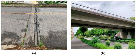 The target bridges were seven simply supported, single-span bridges in Japan’s Ibaraki Prefecture. Information on the bridges is summarized in Table 2. As a representative example, a photograph of Bridge A is shown in Figure 5. Only the materials are listed for Bridge C because its structure was unknown. There is a joint between the road and the bridge in all other bridges except for Bridge D. The pavement was structurally sound and smooth even though it had been in use for a considerable time.