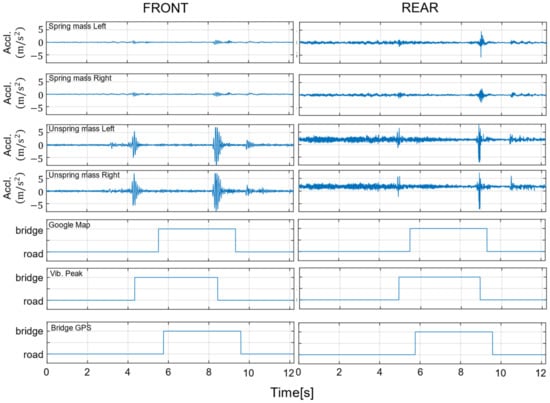 As a possible idea about signal processing to extract the “on a bridge” vehicle response, the method proposed by Wang et al. (2018) [] can be considered. This technique is for estimating the natural bridge frequencies from vehicle vibration. A particle filter (sequential Monte Carlo method) is used to estimate the input profile from the vehicle vibration. The input profile is expressed as the sum of the road surface roughness and bridge vibration at the axle position. Assuming that the vehicle is moving in a straight line, the road profiles of the front and rear wheels are the same. The bridge vibration component can be obtained as the difference between the input profiles of the front and rear wheels. However, this method assumes that the vehicle characteristics are given in advance. Murai et al. (2019) [] succeeded in extracting “on a bridge” signals by using the difference of the unsprung mass vibration of the vehicle. This method is verified by numerical simulation. Shin et al. (2021) [], who examined this method in a field test, pointed out that it is difficult to visually determine the “on a bridge” section due to the influence of environmental uncertainties and measurement noise. However, Shin et al. also showed that C-LSTM networks, which learn from temporal and spatial features, can estimate entry and exit timing. However, utilizing “on a bridge” labels remains a challenge. Because of the low reliability of the GPS devices, it is not easy to eliminate the influence of the road profile. Therefore, this study investigates automatic labeling of the vehicle response to a bridge. The data are measured on the actual vehicle. The models are constructed separately by using the data obtained at each axle.
