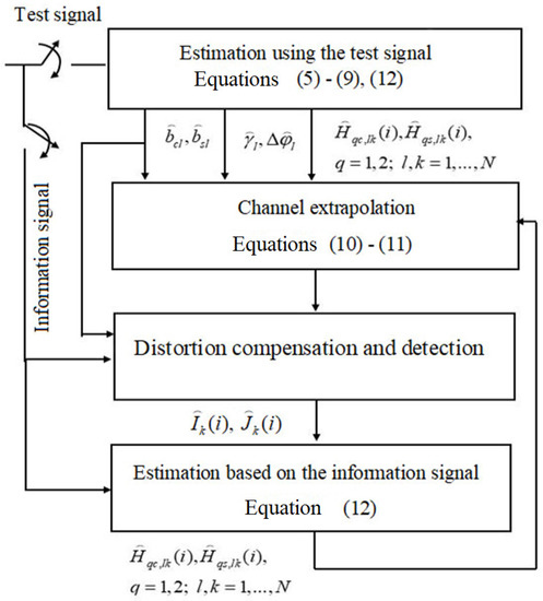 This algorithm is based on a previous algorithm that was published in [41,42]. The entire time of receiving a signal of length is divided into intervals of length , in each of which a test signal of length is transmitted once. Within each interval, the estimation of the channel gains (2), (3) is provided, as well as their extrapolation and the extraction of information symbols over time . Then re-estimation (2), (3) takes place according to the received information sequence, then detection, etc.