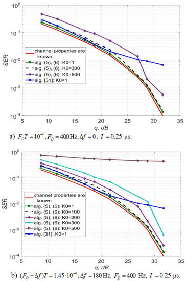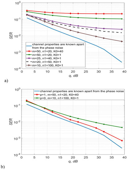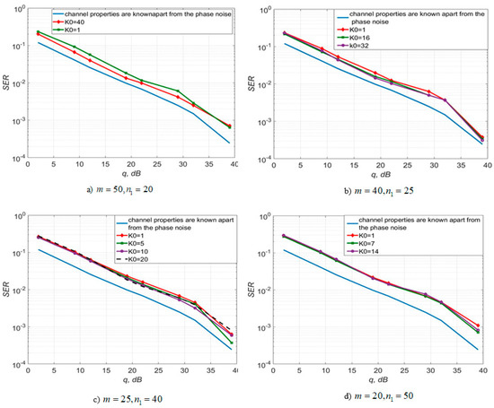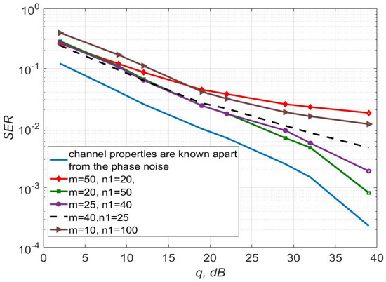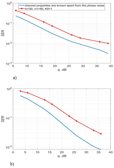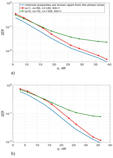 Therefore, the algorithms, described by Equations (5)–(9) and (12) allows getting the lowest SER for 4-QAM, 16-QAM, and 64-QAM for the channel with if the length of the test signal is 20, the number of transmission sessions is 50.