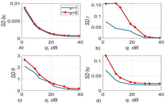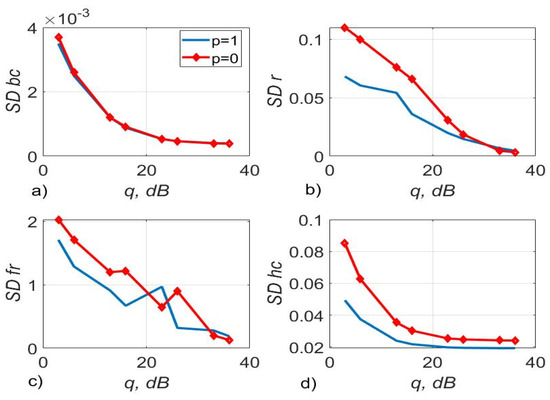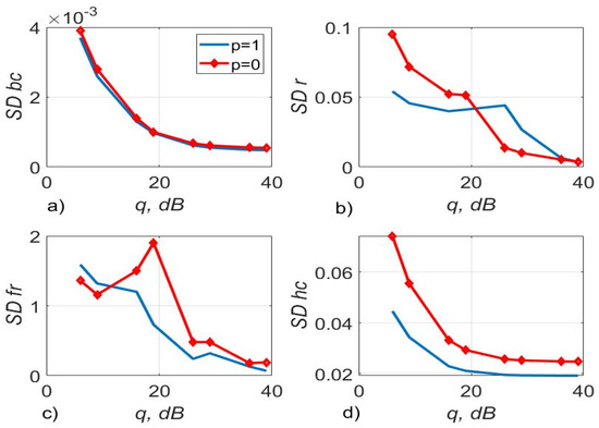 The SD of estimating DC offset (SD bc)—(a), amplitude imbalance (SD r)—(b), phase imbalance (SD fr) (deg)—(c) and channel gains (SD hc)—(d) versus SNR per bit, the test signal was modulated by 4-QAM and the algorithms, described by Equations (5)–(9) and (12) with , was used.