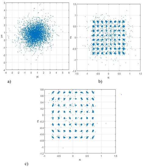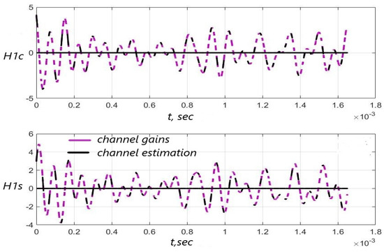 Figure 14 illustrates the reception quality of signals modulated by 16-QAM and 64-QAM. The first order of polynomial was chosen for simulation. Figure 15 and Figure 16 show the realization of the communication channel gains, as well as their estimations and extrapolated values obtained using the procedure (5)–(9), (12) with . In this case, we used 64-QAM and SNR per a bit was 26 dB.