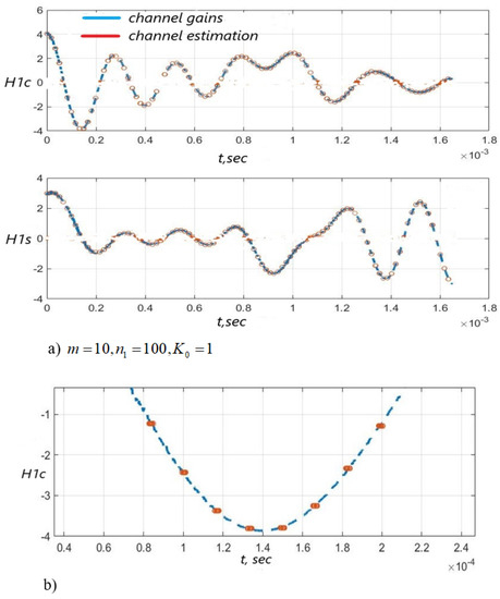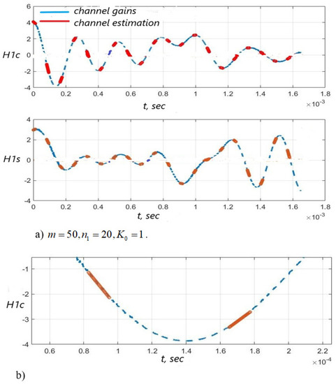 Also, Figure 10 and Figure 11 illustrate that the quality of the channel estimation is higher using a polynomial approximation with , relative to the procedure with . This is especially noticeable in Figure 10 and Figure 11b.