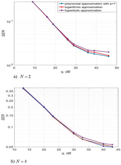 Table 6, Table 7 and Table 8 show SER of 4, 16, 64-QAM in case of using different approximating structures in the algorithms, described by Equations (5)–(9) and (12).