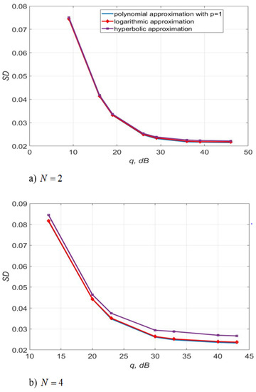 The use of three approximating functions, such as first-order polynomial, logarithmic and hyperbolic, with the same computational complexity of the estimation algorithms, leads to almost the same noise immunity for the considered , , (SISO systems, see Table 2, Table 3 and Table 4). For MIMO systems , the use of a first-order polynomial and logarithmic approximation in algorithms, described by Equations (5)–(9) and (12) makes it possible to slightly increase the accuracy of estimating the channel gains relative to the hyperbolic approximation. In addition, this approach allows the improvement of the noise immunity (see Figure 17 and Figure 18) compared to a logarithmic and hyperbolic approximation. Thus, the SD of the estimation of the channel gains is 1.3 less for the algorithm with polynomial and logarithmic approximation relative to the hyperbolic one. The use of polynomial approximation at SNR of 30–35 dB makes it possible to obtain an energy gain of 0.5–3 dB compared to the use of hyperbolic approximation with the same complexity of the algorithms.