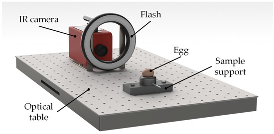 To carry out the experimental tests (Figure 1), an IR camera (mod. SC7600, FLIR Inc., Wilsonville, OR, USA), working in the mid-wave infrared range (MWIR 3.6–5.1 μm), was used. The IR camera has a spatial resolution of 640 × 512 pixels and a noise equivalent temperature difference (NETD) < 20 mK at room temperature. It was equipped with a 50 mm lens and fixed onto an optical table at a distance of about 40 cm from the egg. To heat the target, a xenon toroidal flash of 3 kJ was employed, which typically produced a very small overheating of the egg (less than 1 °C) for about 10 ms. The flash was interposed between the camera and the egg, as to ensure a sufficiently uniform heating of the region of interest. A control unit (Edevis GmbH, Stuttgart, Germany) was also needed to synchronize thermal pulse generation with IR image recording. A special support was realized to hold the egg and to allow it to be rotated precisely by 90° around its transversal axis in order to capture both the front and the lateral aspect of the egg.