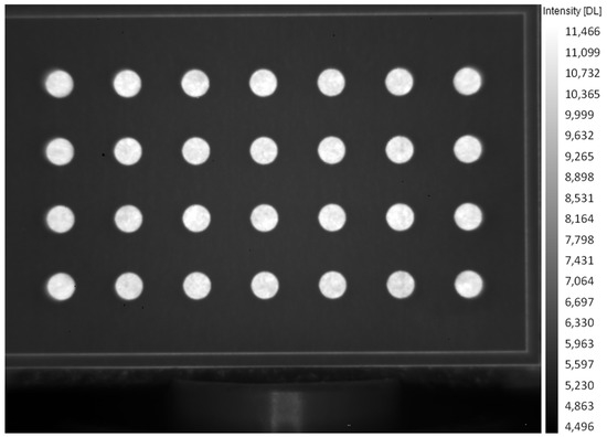 A preliminary 2D camera calibration was carried out in order to convert image pixels into metrical units and remove the aberration of the optics [36]. For this purpose, a calibration grid was manufactured using an aluminum plate and machining a regular grid of circular slots. The circular slots had a 4 mm diameter and a center-to-centre pitch of 10 mm. The calibration grid was mounted in the same position of the egg and temperature and phase images were recorded (Figure 2). Image correction was applied using the proper function implemented in the National Instruments Vision Assistant software.