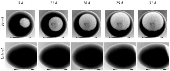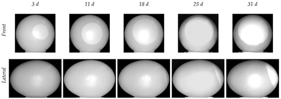 Figure 4 reports a selection of raw IR images recorded after PT (egg XL#7). The images are presented in gray tones, based on digital levels. The shape of the air chamber is pseudo-circular in the front view and like an ovoid cap in the lateral one. Thus, the air chamber volume could be geometrically approximated by the sum of two volumes, a spheroid and an ellipsoid.