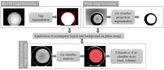 Initially, the software segments both the raw and the phase images: for the first one, it separates the egg from the background, while for the second one, the air chamber projection from the egg; in both cases, it uses a binarization process. After that, a geometric analysis of the air chamber projection takes place. The rectangular region, which circumscribes the segmented egg in the raw IR image, is applied to the phase image. This creates a new, hybrid and resized image with a dark and homogeneous section around the air chamber projection. Hence, the two-dimensional shape of the air chamber projection can be well approximated by an ellipse.