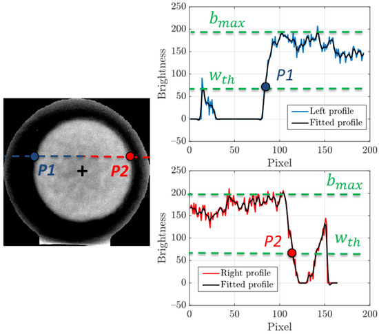 All pixel rows that cross the air chamber projection are fitted with a smoothing spline in order to improve the accuracy of the perimeter measurement. Considering the portion which goes from the first pixel of the row to that associated to the x-coordinate of the center of the air chamber projection (blue dotted line), the point P1 is identified as the last pixel having a brightness level lower than a threshold wth, equal to one third of the maximum brightness of the row profile bmax. The threshold value is determined heuristically and fits well with all the analyzed cases. In the same way, the point P2 is defined on the portion which goes from the pixel associated to the x-coordinate of the center of the air chamber projection to the last pixel of the row (red dotted line).