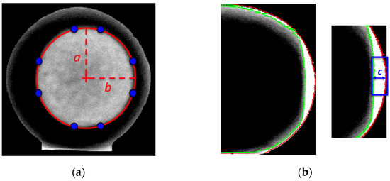 (a) Fitted ellipse and estimated semi-axis sizes (a, b) using eight data points (front view) and (b) external and internal profiles used for estimation of the air chamber height (c).