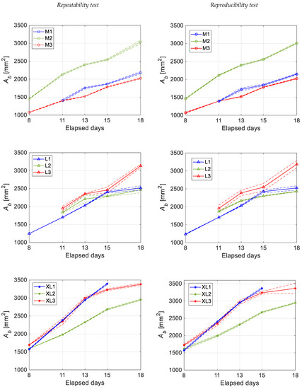 All plots show a monotonic increase of the air chamber area with the elapsed time, as a result of the enzymatic decomposition process of the organic components of the egg. However, it is important to highlight that the growth of the air chamber occurs with different rates, even for the case of eggs belonging to the same category. As regards to the uncertainty related to the repeatability and reproducibility tests, it can be observed that the standard deviation never exceeds 5% of the measurement.
