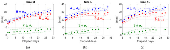Estimation of the mean values (filled dots) of the geometrical parameters of the air chamber at elapsed days for egg of size M (a), size L (b) and size XL (c). and are the mean values of the minor and the major semi-axis of the air chamber on the front view, respectively, while is the mean value of air chamber height on lateral view for each egg size category. σa, σb and σc are the standard deviations of the previous defined quantities.