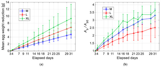 Figure 13a shows the reduction of the egg weight with time. The curves start at the first day of testing (i.e., 3 days after laying), which is used to normalize the ordinate scale. For all the three egg categories, the trend is quite linear with an increased dispersion of the experimental data with time. The slope of the curves is dependent on the egg category: bigger eggs are affected on average by the fastest weight loss, but they also displayed the highest variability. Instead, in Figure 13b, normalized mean values of the air chamber area (i.e., Ab/Ab0) are compared. The increment of the air chamber size is evident in all the plotted curves, even though it does not seem to exist a clear correspondence between increasing rate and egg size. Furthermore, bigger eggs exhibit a more irregular trend and higher data dispersion, especially for longer elapsed times.
