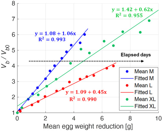 The dispersion of the experimental data is sufficiently small as the M and L size categories are considered, while, again, it is appreciably greater for the XL one. In such case, it would seem that the approximated expression Ab3/2 is no longer able to return the correct value of the air chamber volume after the 16th day of testing. This could be due to the excessive growth of the air chamber and its approach to the egg perimeter, which do not allow the correct computation of a and b in the front view.