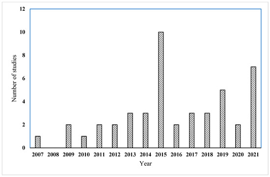 Based on the previous literature search, a total of 46 research papers were reviewed between 2007 and 2021 due to the traditional way to monitor progress before 2007. Figure 1 shows the number of articles per year between 2007 and 2021. Figure 1 shows a continuous increase in the last ten years. In the last five years, more than 20 papers have been found, indicating the importance of this research topic.