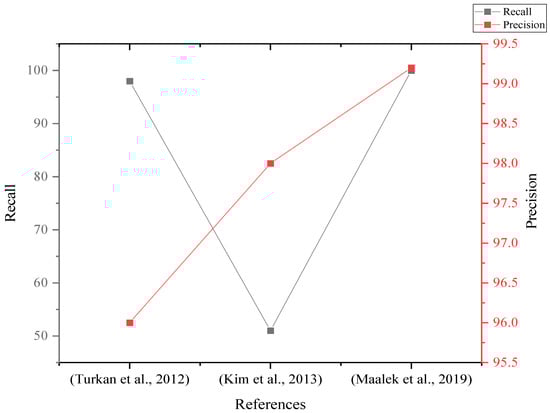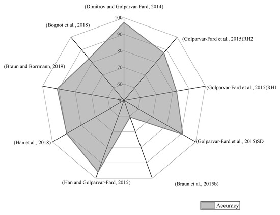 Amongst these studies, a few studies used indicators of object recognition performance (i.e., recall, accuracy and precision) [10,56,63]. Those studies’ findings showed that the recall and the precision rates pointed out by Maleek [63] are higher than those pointed out by Kim and Turkan, as shown in Figure 4. However, the recall and precision results pointed out by Maleek were for columns only compared to a whole project addressed by Kim and Turkan.