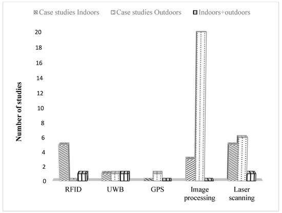 Furthermore, most studies preferred the outdoor environment, as shown in Figure 5. Figure 5 also revealed that most RFID, UWB, and GPS studies were conducted indoors. Therefore, researchers intend to use these technologies to track resources that are generally inside the site. On the contrary, most studies conducted by image-based methods were performed outdoors. Moreover, LS-based studies were performed in any scanning environment as the acquisition technology can detect components inside or outside the site. As a result, there is a correlation based on frequency between specific 3D sensing technologies and certain environments.