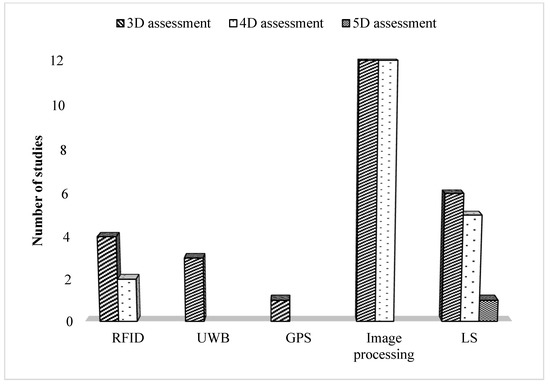 Moreover, this article revealed that almost all studies conducted with RFID, UWB, and GPS systems were performed using 3D assessment, as shown in Figure 6. Figure 6 also found that most studies conducted with image processing or laser scanning methods were performed using 4D assessment. However, only one study used laser scanning for using 5D assessment purposes. As a result, future work should focus mainly on using 5D assessment in the CPM domain integrated with BIM. There are other additional gaps in the collected studies. For example, integrating the BIM model and as-built model is easy to implement but sometimes unreliable. The reason behind that is when the distance between the as-planned location of the object is larger than the predefined spatial similarity criteria [63]. Another example is that most companies do not utilize 3D sensing technologies due to the high cost of technologies and equipment [10]. Software, tools, and algorithms are limited, and they need development to determine all the factors that could affect automated progress monitoring [17,18,19,20].