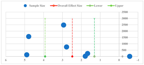Then, publication bias analysis was addressed to identify to which degree it influences the summary outcomes. Thus, the validity of the core findings was assessed. A funnel diagram is a common method to determine whether there is any publication bias. Figure 7 presents a funnel diagram drawn by plotting each effect size against its corresponding sample size to further analyze the publication bias in the whole sample. Figure 6 also shows that the data is consistent with the distribution of effects on either side of the overall effect size; however, the tails of the plot are not symmetrical, which is consistent with a hypothesis of publication bias.
