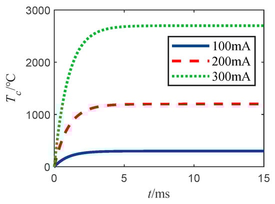 Bringing the parameters of Table 1 into Equation (3), the temperature rise curve of the bridge wire under different amplitudes of steady current injection can be obtained as shown in Figure 1.