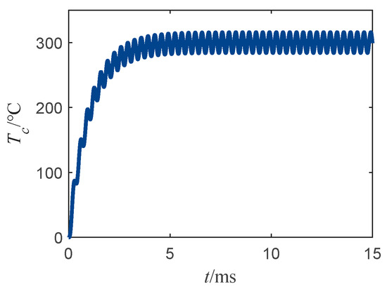 From Equation (8), it can be seen that the first part of the bridge wire temperature rise tends to be constant after reaching 5-times the thermal time constant of the bridge wire, with a constant value of . Moreover, from Equation (9) it can be seen that the peak of the temperature rise fluctuation in sinusoidal form is , and does not change with time, which is in perfect agreement with the trend of the temperature rise curve in Figure 2.