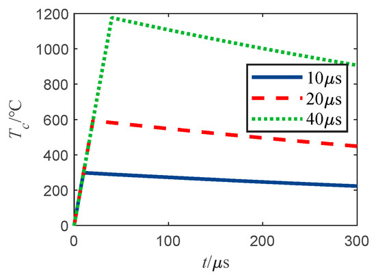 From Equation (34), it can be shown that there is an error between the measured value and the true value under this excitation, and since the pulse width of a single pulse is below the microsecond order, the maximum temperature rise can be obtained according to the infinitesimal equivalence to satisfy: