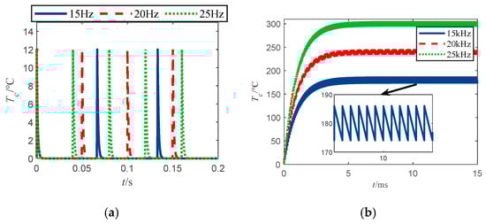 As can be seen from Equation (21), when the repetition frequency of the pulse train tends to infinity, the maximum and minimum values of the bridge wire temperature rise tend to a fixed value of . That is, when the repetition frequency of the pulse train injected into the bridge wire is large, the bridge wire temperature rise curve and the injection of a constant current equal to its RMS value are the same.