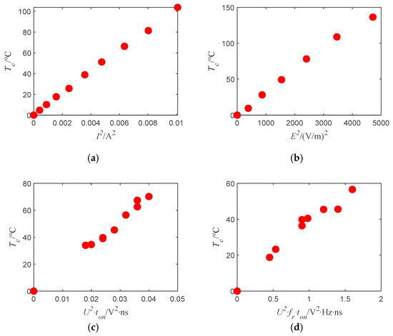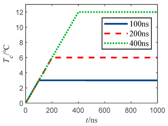 From Equation (24), it can be shown that in the electromagnetic pulse train injection, there is a maximum temperature rise of the bridge wire , that is, the exposed bridge temperature rise is independent of the repetition frequency. This conclusion and Figure 5a, Figure 6 temperature rise curve laws are the same.