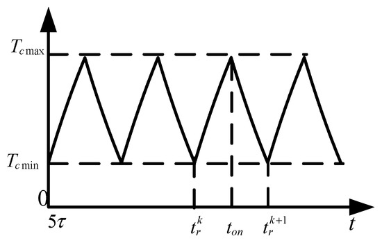 However, in general, the repetition frequency of the electromagnetic pulse train ranges from tens to hundreds of hertz, and the pulse width is in the range of microseconds or less. According to Equation (22), it can be observed that in the electromagnetic pulse train injection, the relative value of the bridge wire temperature rise pulsation measures much greater than 1%. The temperature rise pulsation cannot be ignored, at this time can still be considered infinitesimal, and must be greater than five, thus it can be considered that . From Equation (20), according to the infinitesimal equivalence, the following can be obtained: