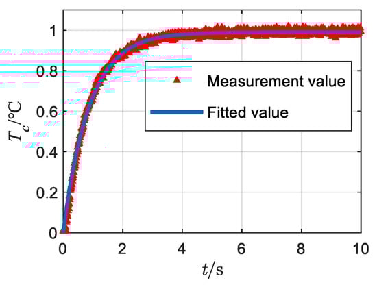 According to Figure 10, the response time of the temperature measurement system is in the order of seconds, and the response time of the temperature measurement device is recorded as . To accurately measure the response time of the temperature measurement device, the average value is obtained by fitting the experimental data several times, and the fitting results are shown in Table 3.