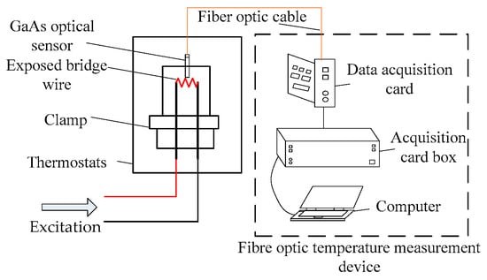 For assessment of the electromagnetic safety of hot bridge wire EEDs, the inductive testing method represents the traditional method, using a voltage, current sensor, or power meter to measure the bridge wire directly or indirectly. To determine its safety, measurements are obtained in various types of induced current, voltage, or power, the amount of induction, and the experimental hot bridge wire EED safety threshold for comparison [10,11,12]. However, at high frequencies, due to the standing wave effect, the difference in current amplitude between different locations is conspicuous [13], resulting in the use of induction measurement methods being limited in frequency, generally not more than 1 GHz. Researchers have turned their attention to temperature measurement. According to the thermodynamic theory of hot bridge wire EEDs, the electric ignition head uses an electric current to heat the bridge wire, and the bridge wire then heats the surrounding energy-containing agent. When the temperature reaches a certain value, the EEDs explode [14]. That is, whether the hot bridge wire EEDs detonate or not is only related to its bridge wire temperature [15]. The temperature measurement method involves monitoring the bridge wire EEDs electromagnetic safety assessment by monitoring the temperature response of the bridge wire. Fiber-optic temperature sensing devices are commonly used in current experiments of temperature measurement [16,17]. Wang B. et al. [18,19] proposed an equivalent method for testing the electromagnetic margin of EEDs in a strong electromagnetic environment. This method uses thermometry to establish the relationship between the temperature rise and field strength of EEDs in an electromagnetic field, and then obtains the equivalent ignition temperature of EEDs based on their 50% ignition field strength. It then compares this temperature with the equivalent ignition temperature of EEDs to obtain the safety margin. In the same year, the team introduced this method directly into the safety assessment of bridging wires under electromagnetic pulse (EMP) injection. Lu, X. et al. [20] established the relationship between the temperature rise of the exposed bridge wire and the current amplitude at a constant current using the pyrometry method, and obtained the true 50% ignition temperature of EEDs by analyzing the relationship between the heat dissipation coefficients of the exposed bridge wire and the real EEDs, thus providing a test method for the safety of EEDs. Xin, L. et al. [21] employed infrared fiber-optic thermometry for bridge wire EEDs and achieved indirect measurement of their induced currents. However, the above article did not analyze the relationship between the measured temperature rise of the exposed bridge and its true value.