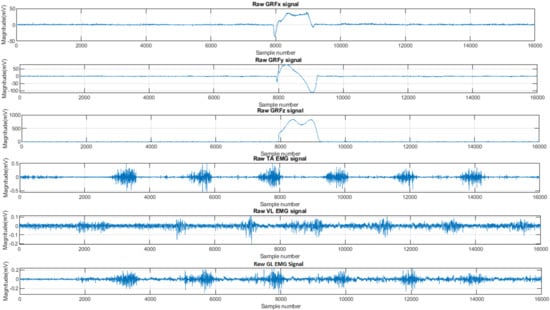 The database of EMG and corresponding GRF data was collected from the Akashi et al. [] study. The study involved 45 adults with at least 5 years post-onset of Type 2 diabetes, divided into three groups: A control group (n = 16), a diabetic neuropathic group (n = 19), and a diabetic neuropathic group with a previous history of plantar ulceration (n = 10). However, the available dataset consisted of a total of 21 subjects from three different groups: control (n = 6), diabetic neuropathy (n = 6), and diabetic neuropathy with ulceration (n = 9). The data consisted of EMG of the right vastus lateralis (VL), gastrocnemius lateral (GL), and tibialis anterior (TA), and the 3-dimensional components of ground reaction force (GRFx, GRFy, GRFz) raw signals. In Figure 1, a sample of these EMG and GRF signals collected from the study [] is shown. The data were sampled at 1000 Hz and collected according to the experimental procedure in []. The patients were examined for neuropathy using the Michigan neuropathy screening instrument (MNSI). The detailed protocol of the study has been explained by the Akashi et al. [] study. Supplementary Table S1 summarizes the total data samples after segmentation and quality evaluation, where some examples refer to the segmented signals.