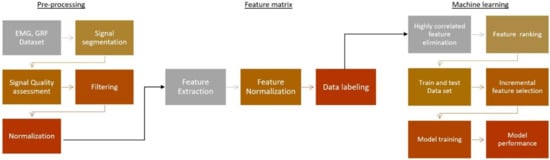 The following supporting information can be downloaded at: https://www.mdpi.com/article/10.3390/s22093507/s1, Table S1: Dataset summary after segmentation; Table S2: Feature vectors summary for GRF; Table S3: Feature list from different selection techniques from GL muscle EMG; Table S4: Feature list from different selection techniques from VL muscle EMG; Table S5: Feature list from different selection techniques from TA muscle EMG; Table S6: Feature list from different selection techniques from GL-VL muscles EMG; Table S7: Feature list from different selection techniques from GL-TA muscles EMG; Table S8: Feature list from different selection techniques from TA-VL muscles EMG; Table S9: Feature list from different selection techniques from GL-VL-TA muscles EMG; Table S10: Performance evaluation matrix using features from GL muscle EMG for different feature selection techniques; Table S11: Performance evaluation matrix using features from VL muscle EMG for different feature selection techniques; Table S12: Performance evaluation matrix using features from TA muscle EMG for different feature selection techniques; Table S13: Performance evaluation matrix using features from GL and TA muscles EMG for different feature selection techniques; Table S14: Performance evaluation matrix using features from GL and VL muscles EMG for different feature selection techniques; Table S15: Performance evaluation matrix using features from TA and VL muscles EMG for different feature selection techniques; Table S16: Performance evaluation matrix using features from GL, VL, and TA muscles EMG for different feature selection techniques; Table S17: Feature list from different selection techniques from GRFx; Table S18: Feature list from different selection techniques from GRFy; Table S19: Feature list from different selection techniques from GRFz; Table S20: Feature list from different selection techniques from GRFx-GRFy; Table S21: Feature list from different selection techniques from GRFx-GRFz; Table S22: Feature list from different Selection Techniques from GRFy-GRFz; Table S23: Feature list from different selection techniques from GRFx-GRFy-GRFz; Table S24: Performance evaluation matrix using features from GRFx for different feature selection techniques; Table S25: Performance evaluation matrix using features from GRFy muscle EMG for different feature selection techniques; Table S26: Performance evaluation matrix using features from GRFz muscle EMG for different feature selection techniques; Table S27: Performance evaluation matrix using features from GRFx and GRFy muscles EMG for different feature selection techniques; Table S28: Performance evaluation matrix using features from GRFx and GRFz muscles EMG for different feature selection techniques; Table S29: Performance evaluation matrix using features from GRFy and GRFz muscles EMG for different feature selection techniques; Table S30: Performance evaluation matrix using features from GRFx, GRFy and GRFz muscles EMG for different feature selection techniques.