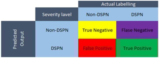 Furthermore, precision is another measure of performance used when evaluating the performance of a ML model, which is the ratio of patients who were correctly identified as positive to the total number of positive predicted patients. It can be maximized by an impractical classifier, where they never predict the DSPN severity level to avoid false alarms. For example, Equation (3) can be used to calculate the precision [].