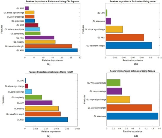 Top-ranked features from the GL muscle EMG signal by (a) Chi-Square, (b) mrmr, (c) Relieff, (d) fscnca feature selection techniques.