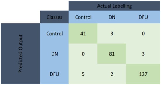 This study dealt with a three-class problem, where we considered three classes: control, DN, and DFU. The evaluation matrixes were calculated depending on the accurate identification of the correct class. For EMG analysis, we found the best accuracy of 96.18% using the top 22 features from the chi-square feature ranking technique in the two-channel analysis of GL-VL. In the GRF analysis, the model showed 98.68% accuracy by using the top 7 features from the fscnca feature ranking technique from the combination of the GRFx-GRFz signal. In this study, before training our ML models, we preprocessed the dataset in a very detailed way involving removing noise and proper filtration, normalization, and segmentation of the signals, which created this dataset without bias or overfitting issues. Because of our proper data preprocessing, our work obtained very good performance with EMG and GRF data analysis in identifying DN and DFU. This indicates that analysis for sensitive biomechanical data required very detailed preprocessing before being used for training ML models. With the help of proper preprocessing, higher accuracy can be achieved. This is one of the major contributions of this study. Another major contribution of this study is that using the new feature extraction scheme for EMG signals, it helped us extract important features.