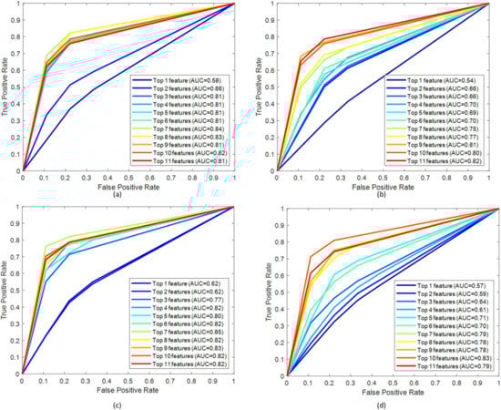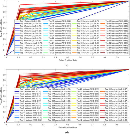 ROC curve for top-ranked features from the GL muscle EMG signal by (a) Chi-Square, (b) mrmr, (c) Relieff, (d) fscnca feature selection techniques.