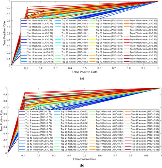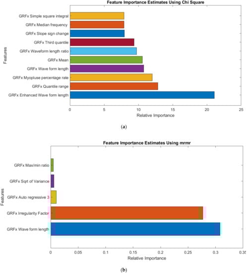 A large number of attributes may confuse the model. Feature selections allow further dimensionality reduction. In this study, the forward feature selection approach was followed by adding one feature at a time and then checking the performance. To ensure using the best feature, the feature matrix was reordered according to feature importance. In this study, we mainly used filter type feature selection algorithms provided by MATLAB, which were Chi-square [], minimum redundant maximum relevant (mrmr) [], neighborhood component analysis (fscnca) [], and Relieff [] algorithms.