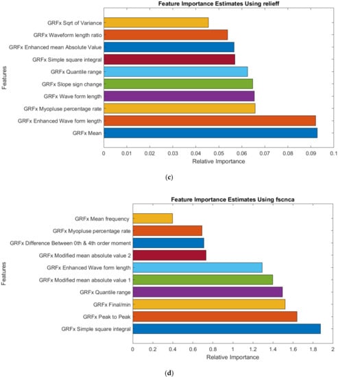 Top-ranked features from GRFx signal by (a) Chi-Square, (b) mrmr, (c) Relieff, (d) fscnca feature selection techniques.