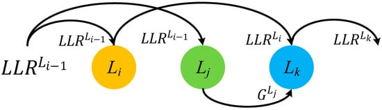 The priority-based layered schedule works as follows. The LLR in layer can update in priority and get . Due to pipeline conflicts, the layer reuses the old LLR value to calculate the gain . If the update of LLR in layer can be done before decoding the layer , then the layer can update the value based on the result of and the gain can also be added to the updated LLR in layer . As shown in Figure 1, the update can be expressed as (8) and (9)