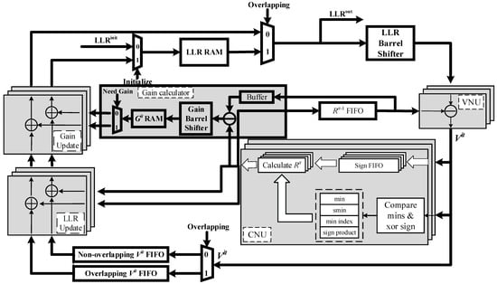 If pipeline conflicts happen during the decoding, LLRs of the VNG with conflicts will not be updated. Combining with Figure 2, the impact of pipeline conflicts on decoding can be mitigated as follows. If the LLR in the previous layer has not been updated yet, then the old LLR value is read again from LLR RAM for the current layer. VNU calculates its variable-to-check message and passes it to the CNU. At the same time, is not necessary to be buffered into FIFO because its corresponding LLR will not be updated in this layer. Different from the layered schedule, is calculated separately with sign buffered in a separate FIFO. Then, it will minus the obtained from the previous iteration and obtain the gain . Before storing the gain into RAM, gain should enter the gain barrel shifter and be shuffled to the corresponding position of the submatrix that it will be added with in the other layer. When the LLR is updated in other layers like in the layered decoding schedule, the gain then adds to this updated LLR.