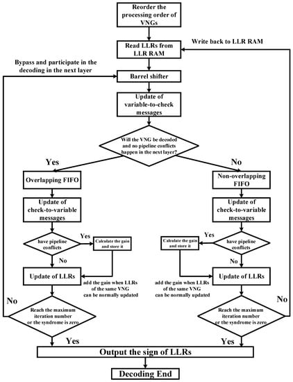 The next step is the process of the LLR update when the pipeline conflict occurs or does not occur. If no pipeline conflicts happen, LLRs can be normally updated as the layered schedule. After update, LLRs of non-overlapping VNGs will be written back to the LLR RAM. LLRs of overlapping VNGs will be bypassed to the barrel shifter and participate in the decoding in the next layer. At the end of one iteration, the codeword will be decided according to the sign of LLRs. If the iteration has reached the maximum iteration number or the calculated syndrome is equal to zero, the decoding will end. If not, the decoding will continue.