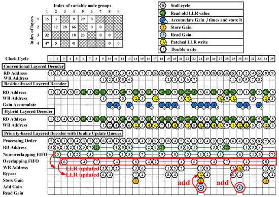 The residue-based layered decoder, hybrid decoder, and priority-based layered decoder with double update queues eliminate stall cycles so that LLRs of a VNG can be read out from memory at each cycle. The solution to pipeline conflicts in the residue-based decoder [14] works as follows. At the sixth cycle, there exists a pipeline conflict to the second VNG. LLRs of the second VNG have to read the old LLR values from the RAM and use these values for decoding. At the 10th cycle, the gain of the second VNG in the first layer is saved in a register file for patching. The second VNG in the second layer can be updated normally at the 14th cycle and the gain is added with the updated LLRs when the LLR write operation happens, here referred as patched LLR write. In this way, the performance loss is compensated. However, the residue-based decoder has to postpone updates of LLRs when the pipeline conflicts happen to the LLRs in one variable node [14]. In this example, LLRs in the fourth VNG can never be updated because of the pipeline conflict and postponed patch.