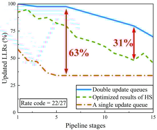 From the illustration shown in Section 3.4, it can be seen that double update queues can reduce the pipeline conflicts and increase the percentage of updated LLRs during decoding. To demonstrate the effect of double update queues in making more LLRs updated, we choose the PCM in 5G NR (code rate = 22/27). Figure 5 shows the percentage of updated LLRs per iteration during decoding depending on the number of pipeline stages. With the increase in pipeline stages, the percentage of update LLRs per iteration is gradually getting worse. Compared with optimized results in [15], the double update queues increase the percentage of updated LLRs by 4–31%. Compared with the single update queue, the improvement is between 12% and 63%.