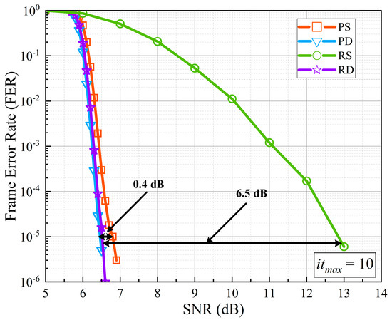 In order to directly reflect the effectiveness of the priority-based schedule and double update queues in improving decoding performance, we made a Monte Carlo simulation to obtain the frame error rate (FER) curves in the AWGN channel as shown in Figure 6. One million codewords are sent for each SNR. The maximum iteration number was set to 10 and the modulation format was set to quad-phase shift keyed (QPSK). The PCM is chosen from 5G NR with code rate 22/27. The simulated priority-based decoder with a single update queue, priority-based decoder with double update queues, residue-based decoder with a single update queue, and residue-based decoder with double update queues are all with 13 pipeline stages. All these four decoders were implemented as an offset min-sum decoder with LLRs quantized to eight bits and messages quantized to six bits, as [15] did.