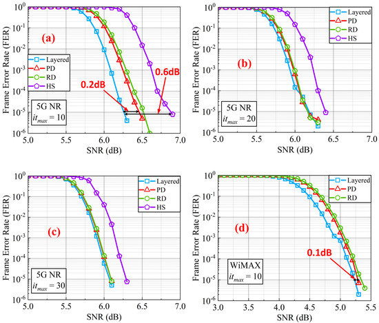 For a fair comparison with the hybrid decoding, we take FER = as the standard as [15] did. In Figure 7a, it can obviously be seen that for 5G NR the loss of SNR performance between the layered decoder and the priority-based decoder with double update queues is 0.2 dB. The loss of SNR performance between the layered decoder and the hybrid decoder is 0.6 dB. Thus, the decoding performance loss at FER = narrowed from 0.6 dB to 0.2 dB by using the priority-based layered schedule with double update queues when the maximum iteration is set to 10. When the maximum iteration is set to 20 and 30, the loss of SNR performance does not exist. In order to reflect the improvement of the double update queues, performance of residue-based layered decoder with double update queues is also simulated. The loss of the residue-based decoder is just 0.3 dB after using the double update queues at 10 iterations. Note that the priority-based layered schedule has a faster convergence than the residue-based layered schedule. In Figure 7d, for WiMAX, the loss of SNR performance between the layered decoder and the priority-based decoder with double update queues is only 0.1 dB when the iteration number is set to 10. For WiMAX, the loss of SNR performance between the layered decoder and the residue-based decoder with double update queues is 0.2 dB. The simulation results for WiMAX also shows the effect of priority-based decoder with double update queues in reducing the loss of decoding performance caused by pipeline conflicts.