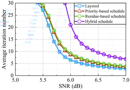 Analysis of average iteration number among different decoders is shown in Figure 8. The maximum iteration number is set to 30. The iteration finishes when codeword C and PCM H satisfy or the decoding has reached the maximum number of iterations. From Figure 8, it can be found that at the same SNR, the average iteration number of the priority-based schedule with double update queues is highly reduced compared with that of the hybrid schedule. This greatly improves the throughput of the decoder. At higher SNR, the iteration of our design is nearly half of the hybrid layered decoder.
